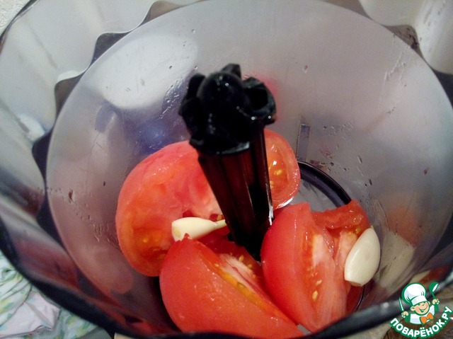 Помидоры ошпарить кипятком, снять кожицу и измельчить в блендере вместе с чесноком.