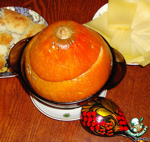 Натереть внутреннюю поверхность тыквы солью и перцем. Перелить в неё горячее пюре, закрыть срезанной крышечкой и поставить в смазанную маслом чашу мультиварки.