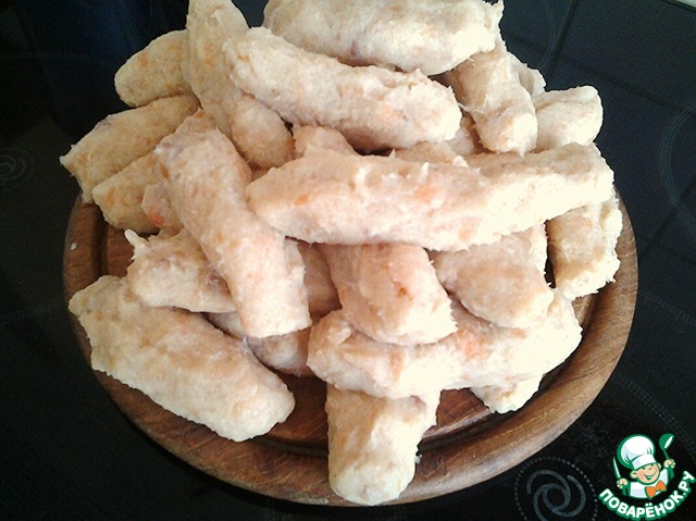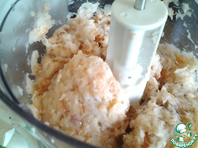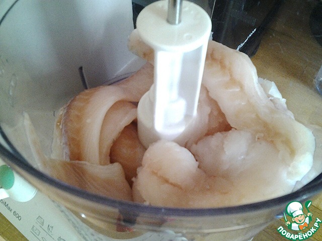 Тем временем занимаемся рыбой. Мороженую сайду ( можно взять треску, хека, тилапию )моем, хорошенько отжимаем и перемалываем в комбайне или пропускаем через мясорубку с крупной решеткой. Делаем это по возможности оперативно. Почему?