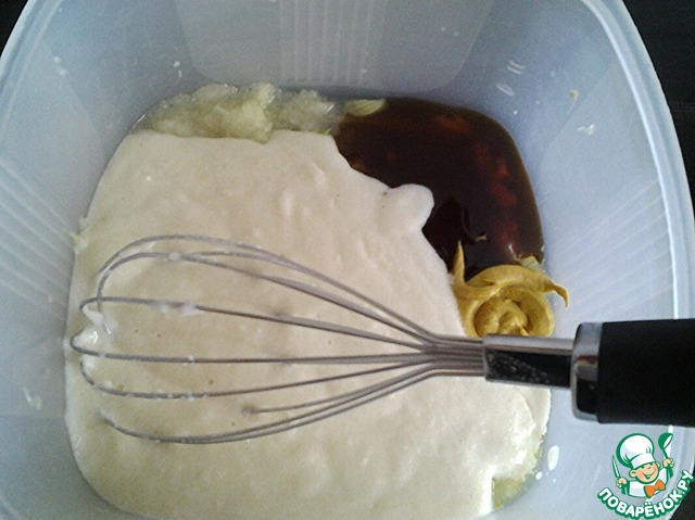 Тем временем к остывшей манной каше добавляем соус "Терияки ", горчицу и натертую на терке луковицу. Моя луковка была совсем " игрушечная ", 30 г, мне кажется, что это оптимальное количество лука. Но вы можете добавить лука больше или не добавлять вовсе. Перемешиваем до однородности.