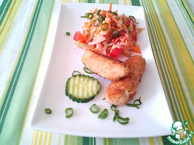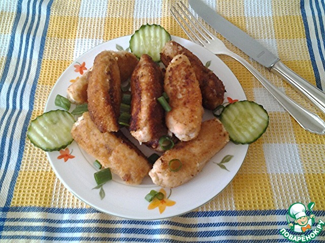 В рыбный фарш добавляем манную кашу, 3 ст. л панировочных сухарей, соль-перец, и быстро мокрыми руками лепим нашу "поленницу". Если нас отвлек телефонный звонок, задача по математике/ботанике/ гармонии или подобный кактаклизм, срочно убираем фарш в холодильник. С холодным фаршем легче работать, он не "убегает".