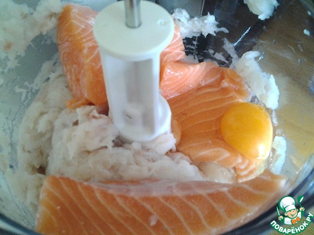 Добавляем к сайде куски семги без костей и кожи и яйцо, быстро перемалываем в комбайне. Если вы предпочитаете мясорубку, то просто пропустите через нее всю рыбу и добавьте в фарш яйцо.