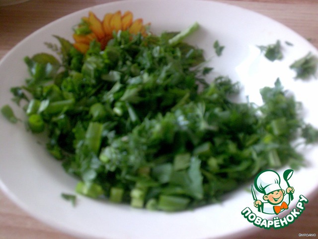 Петрушку, укроп и зеленый лук мелко нарезать.