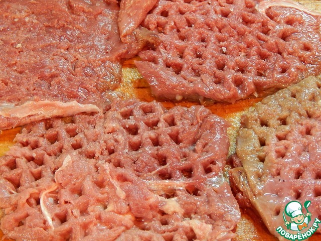 Грудку разрезаем на порционные куски и отбиваем с добавлением любимых специй.