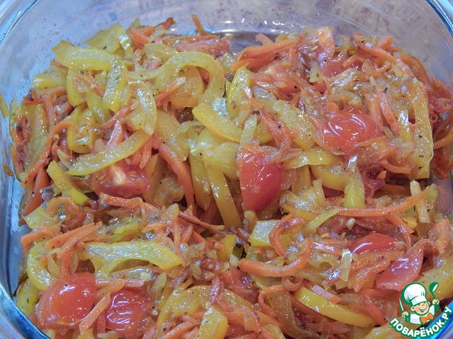 Нарезанный брусочками перец и морковь слегка обжариваем, добавляем измельченный лук и обжариваем все вместе почти до готовности (минут 6)