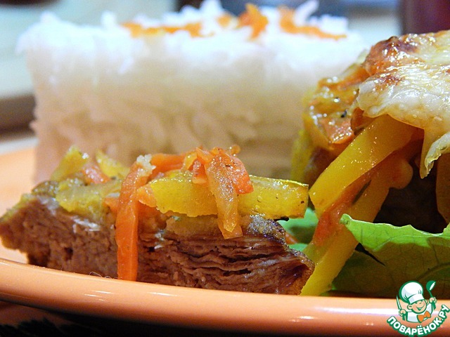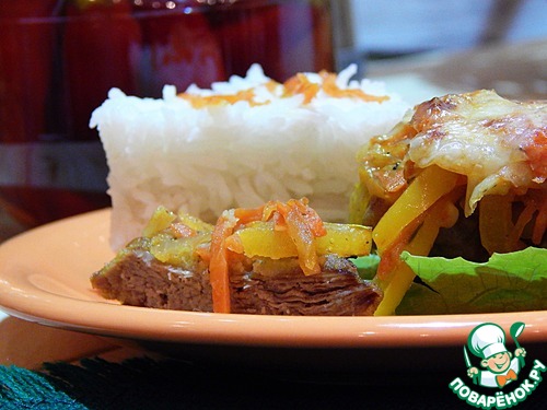 Выкладываем мясо в огнеупорную форму. На него сверху овощи.
