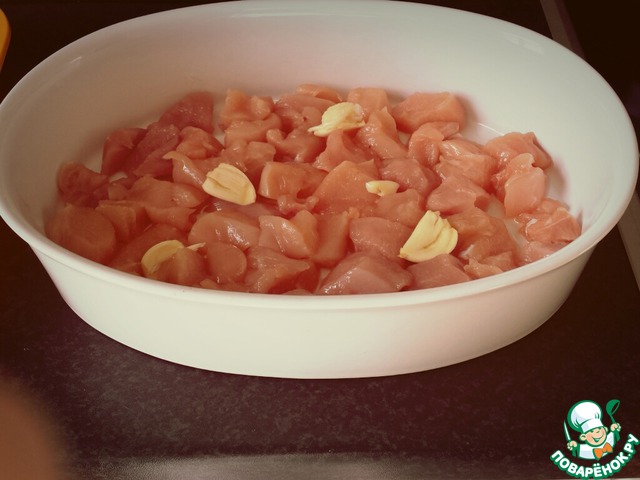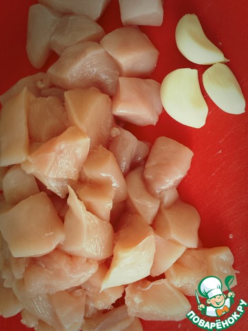 И так для начала порежем куриное филе на порционные кусочки, я предлагаю Вам упрощенный и быстрый по времени вариант, и поэтому, я не стала заранее мариновать грудки, и сразу порезала на кусочки и на месте посолила и поперчила, а так же почистила 3 зубчика чеснока (вы можете добавить и свои любимые пряности, сушеные травы или букет специй для курицы)