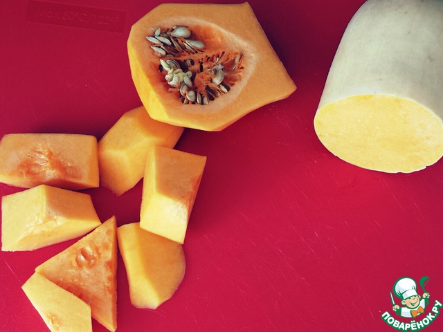 Как и курицу, тыкву я посолила и поперчила "на месте". Я обожаю пряности, а мой супруг не очень, по этому я не использую никаких трав и специй, кроме соли и перца. Но Вы можете добавлять любые свои любимые пряности, рекомендую сухие травы, а также прекрасно подойдет карри, придаст аромат и красивый золотистый цвет.