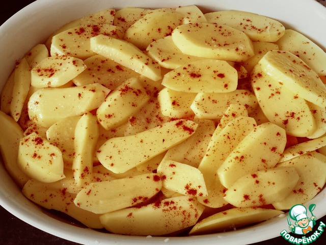 Чистим и режем картошку, можно дольками или кружочками, выкладываем на тыкву, соль, перец, специи... Я позволила себе немного паприки для румяной корочки
