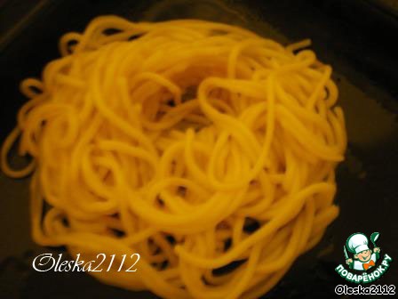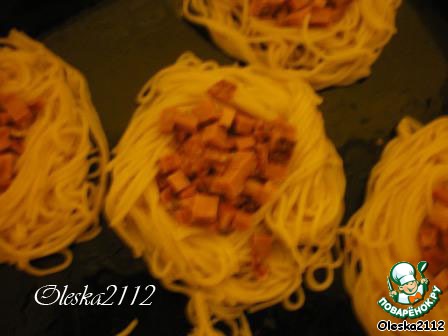 По количеству едоков отвариваем спагетти в большом количестве воды с 1-2 ст.л растительного масла и конечно же подсоленной. Варим в кипящей воде 5-6 минут. Затем сливаем их. Далее смазываем противень растительным маслом и при помощи вилки выкладываем спагетти в виде "гнёздышек".