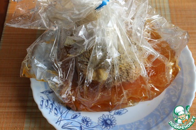Далее укладываем в мешок для запекания, очень хорошо завязываем, чтоб в него не попала вода, заливаем кипятком, чтоб мясо было полностью покрыто