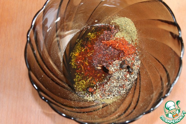Смешать соль, специи для мяса, свежесмолотый черный перец, соль, хлопья перца чили и паприки, и оливковое масло