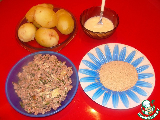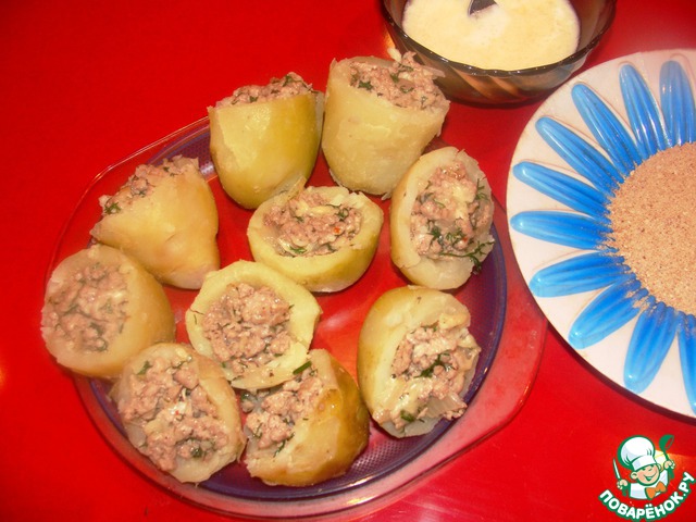 Яйцо взбить со сметаной. Окунуть нафаршированные половинки картофеля в полученную яичную массу и обвалять в панировочных сухарях.