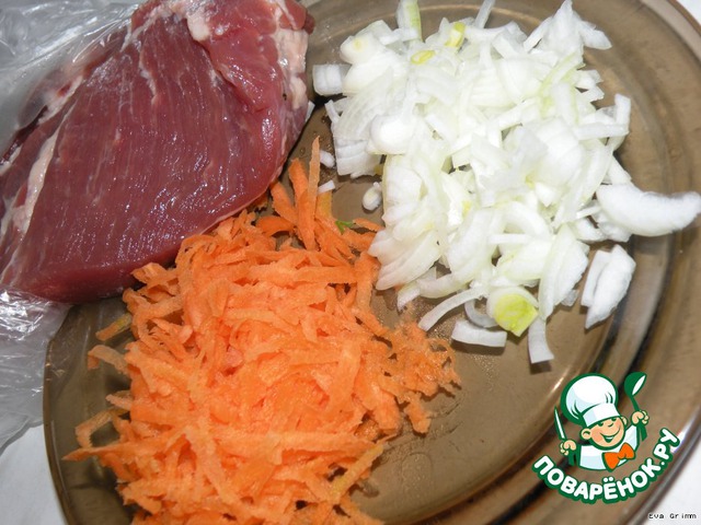 Мясо нарезаем достаточно мелко кубиками, лук меленько режем, морковку на крупной терке натрем.