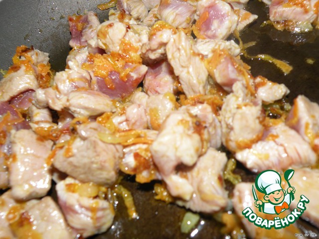 Пережариваем лук с морковкой, добавляем мясо и доводим почти да готовности (посолить немного во время пережарки)