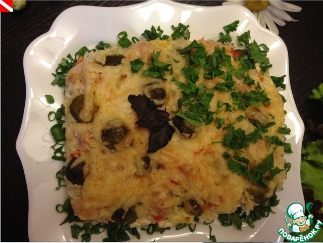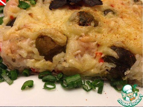 Примерно через 30 минут вынимаем из духовки, убираем крышечку и посыпаем тертым сыром. Запекаем еще минут 7-10.