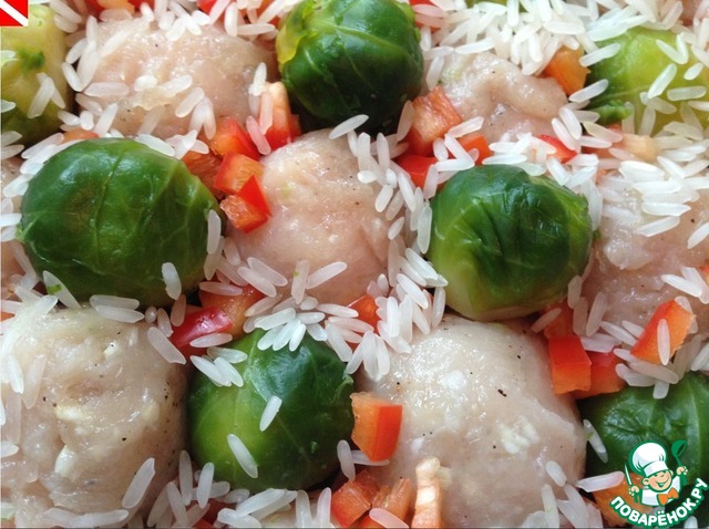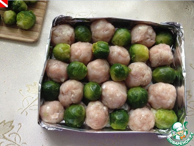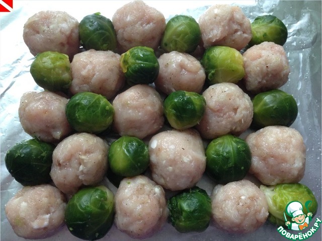 Фольгу (2 слоя) смазываем растительным маслом и выкладываем на нее размороженную капусту и мясные шарики в шахматном порядке.