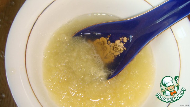 Чеснок давим на чесночнице, добавляем соль и немного воды