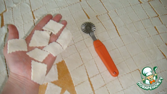 Разрезаем наш пласт на мелкие квадратики (вот этим спец. ножиком, можно и обычным)
