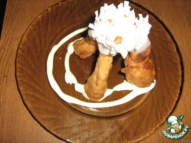 Лапки солим, перчим, обваливаем в муке, обмакиваем в кляре и обжариваем во фритюре, недолго.