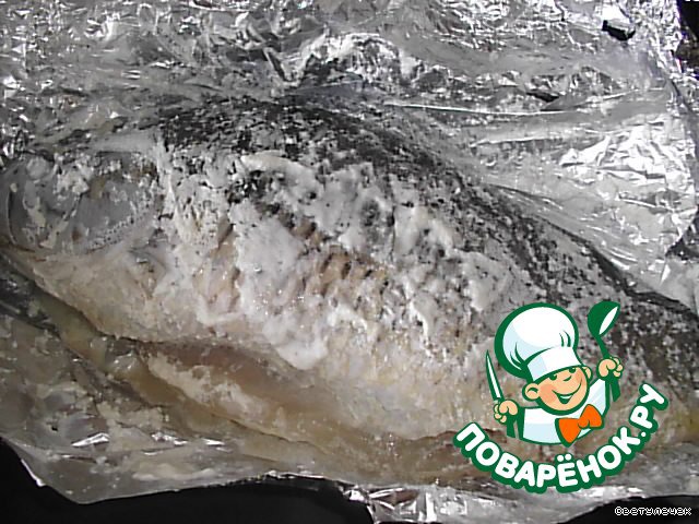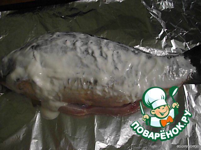 Смазать карп сметаной, завернуть в фольгу и отправить в духовку на 30 минут.