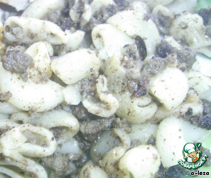 После 30 мин. снимаем печень вместе с насадкой, в воду кидаем макароны, солим, ставим на место печень и продолжаем на режиме "варки" 15 мин. Макарошки провариваются, а сверху капает сок печени, которая тоже готовится в это время.