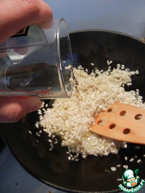 Затем в рис добавляем алкоголь- белое или красное вино или то, что необходимо по рецепту. Выпариваем алкоголь практически полностью.