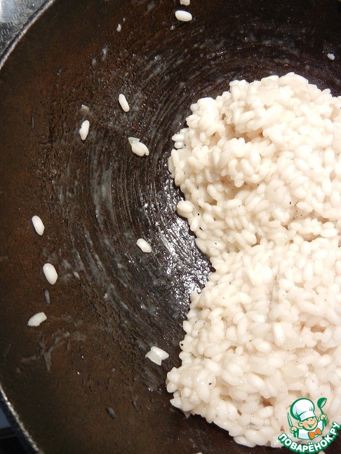 Итак, добавляем рис для ризотто и обжариваем его вместе с луком. Обжариваем до тех пор пока зерна риса не начнут впитывать в себя масло и станут прозрачными по краям. Если Вы решите готовить ризотто с добавками, то на этой стадии уже можно добавить дополнительные ингредиенты.