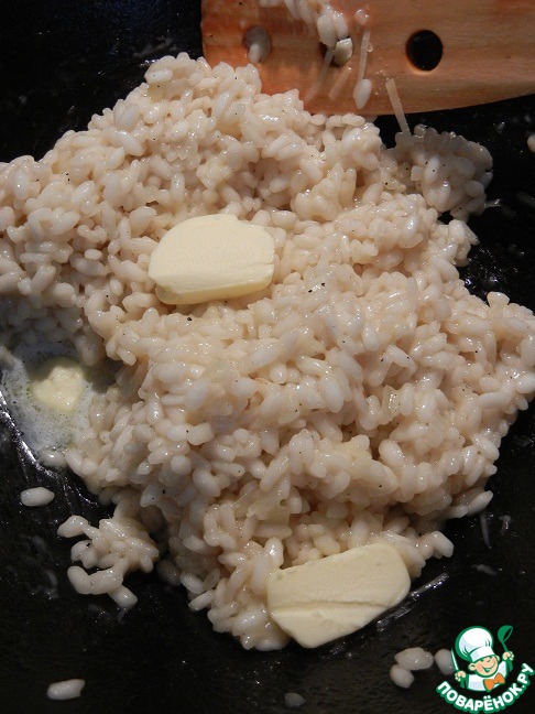 Далее в готовое ризотто добавляем кусочки холодного сливочного масла и аккуратно перемешиваем до кремового состояния. Перед подачей посыпаем тертым пармезаном и подаем на теплых тарелках.
