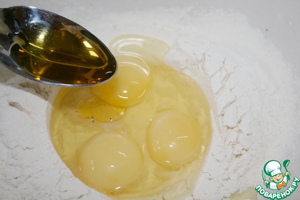 Из муки, яиц, желтка, оливкового масла и соли вымесить тесто как на пельмени. Завернуть его в пленку и положить в холодильник на 30 минут.
