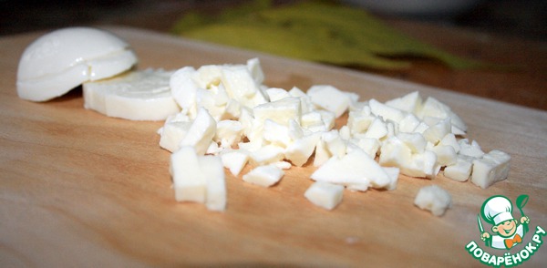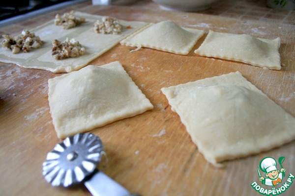 Накрыть тестом, прижать, разрезать на квадратики так, чтобы начинка была посредине.