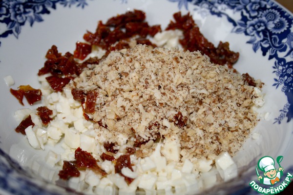 К сыру и помидорам добавить орехи. Всё перемешать.