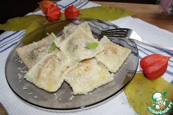 Растопить сливочное масло, положить равиоли на тарелку, полить маслом, посыпать перцем и тертым сыром.