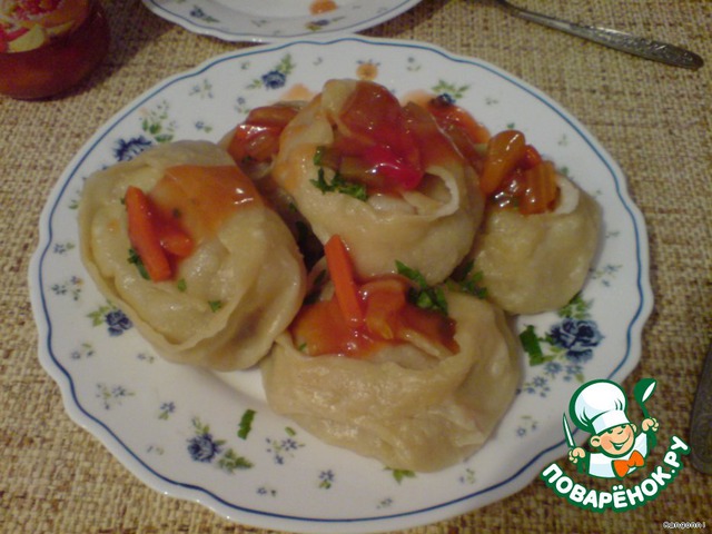 готовые манты полейте приготовленным кисло-сладким соусом с ананасами, а можете полить любым соусом, или сметанкой, или просто сливочным маслом с зеленью. На ваш вкус!