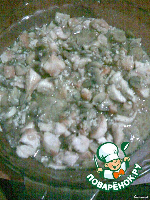 Складываем в огнеупорную форму грибы и курицу, перемешиваем.