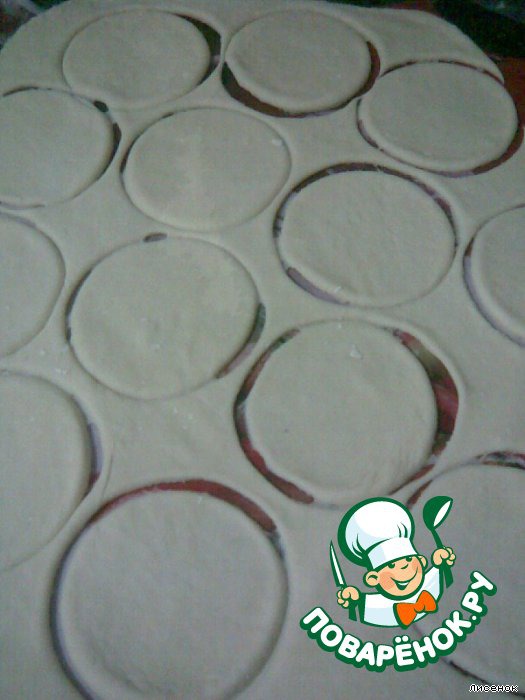 Готовое тесто раскатать и стаканом вырезать кружочки.
