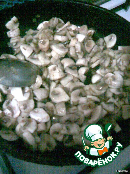 Добавляем нарезанные пластинками грибы, тушим до выпаривания жидкости
