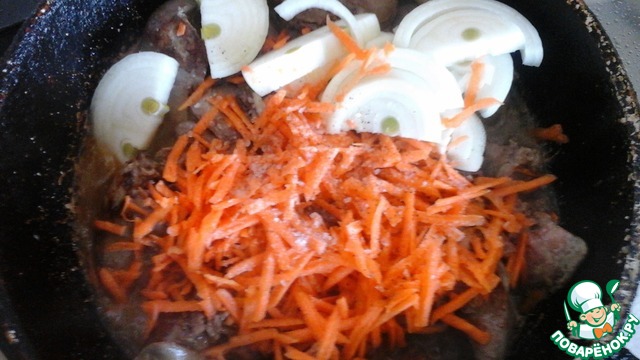 Печень обжариваем на подсолнечном масле с добавлением моркови и лука 10 минут, солим, перчим...
