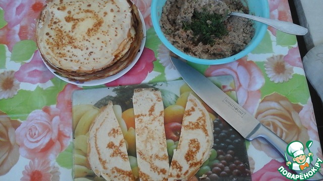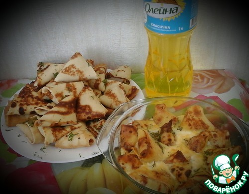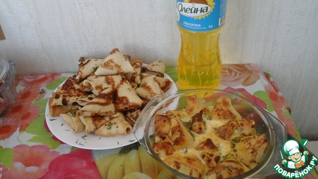 Взбивала 1 яйцо, ложку сметаны и зелень и залила смесью блинчики, поставила в предварительно разогретую до 180 градусов духовку на 15 минут...