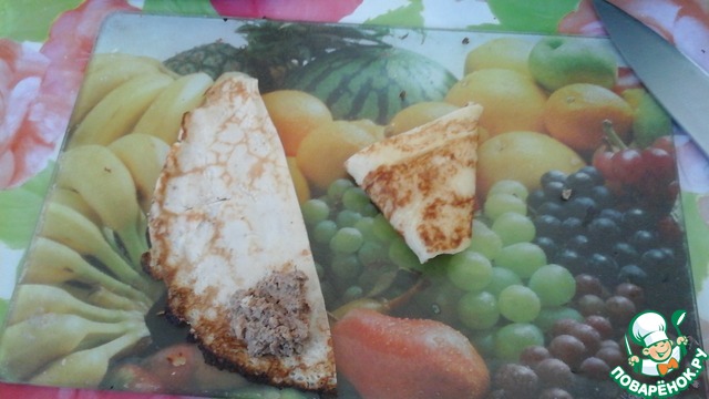 На край блинчика кладем чайной ложечкой начинку и сворачиваем треугольниками до конца...