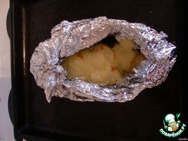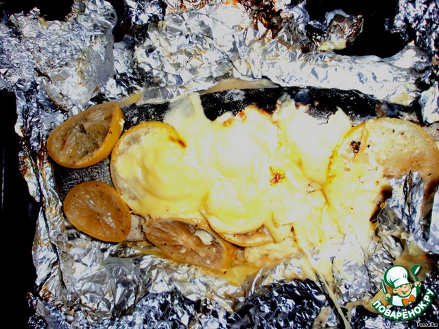 По истечении времени достать рыбу, раскрыть фольгу, положить кусочки сыра и еще на 10 мин в духовку.