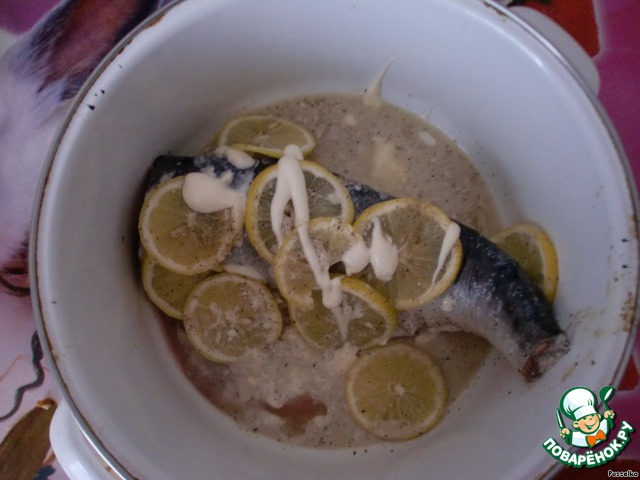 Делаем маринад для рыбы: майонез, специи, соль, перец. Выдавливаем 1 лимон, добавляем к маринаду, нарезаем второй лимон кружочками. Обмазываем рыбу, внутрь и сверху выкладываем дольки лимона и оставляем мариноваться либо на ночь, либо на 2 ч.