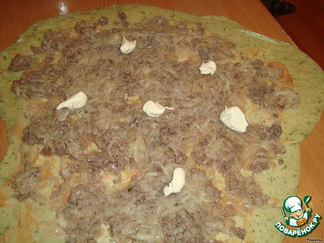 Выложить фарш на тесто и местами положить по ложечке плавленого сыра. У меня - Хохланд с ветчиной.