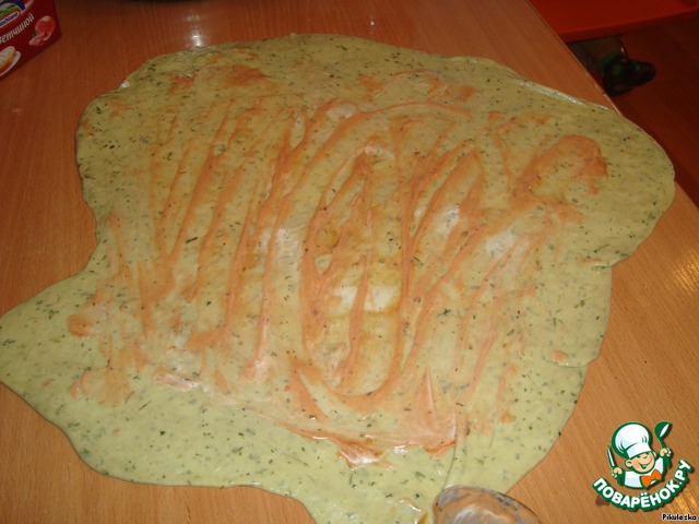 Петрушку измельчить в блендере, добавив немного воды. Это будет наша основа для теста. Замесить тесто на 1 яйце. Тесто раскатать в пласт и смазать его смесью майонеза с кетчупом.
