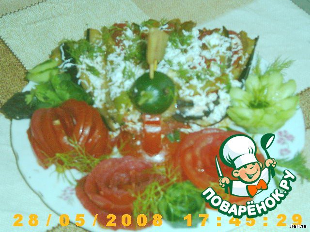 Сегодня у меня был настрой только на баклажан (поесть), заодно и эстетически украсить. Решила объединить все способы разделки цветов из помидора и огурца (которые уже выставляла в различных блюдах). И что то вроде павлина сделала)))