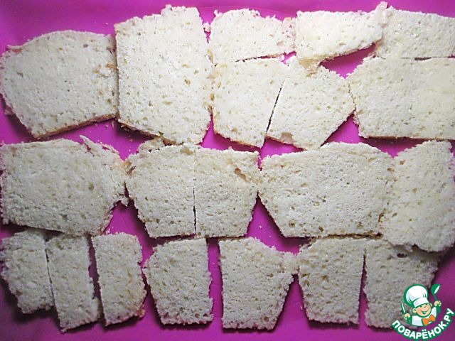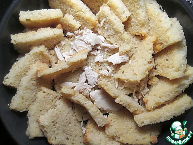 Ломтики хлеба желательно брать квадратной формы. Срежьте с них корочки. Разделите 8 ломтиков пополам, 2 ломтика на 3 части, 2 оставьте как есть. Подсушите их слегка в духовке. Нарежьте тонкими ломтиками отварное куриное филе.