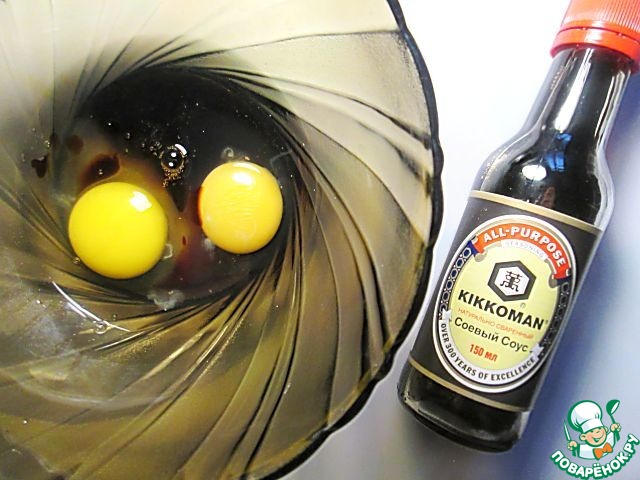 Яйца взбейте венчиком с соевым соусом.