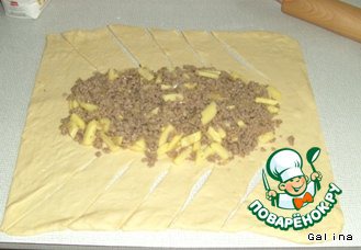 Когда тесто подойдет раскатываем его в прямоугольник, на середину выкладываем начинку и делаем надрезы по бокам.