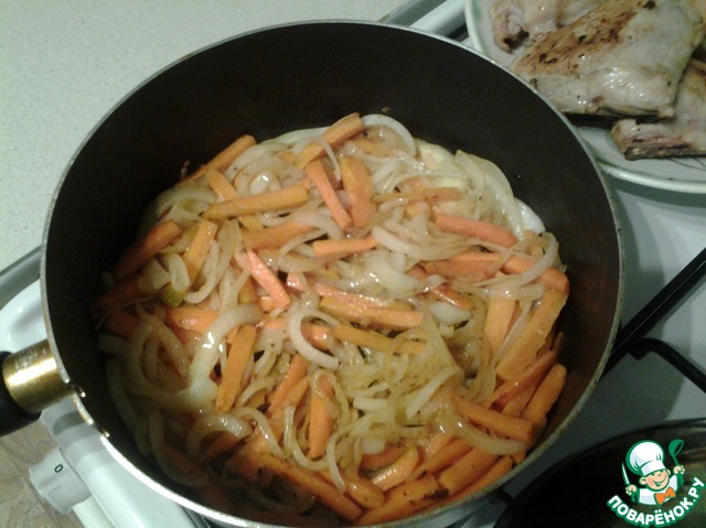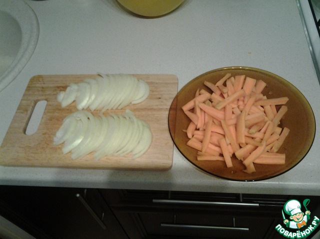 Пока наши бедрышки подрумянивались, я нарезала лук полукольцами, а морковочку крупными брусочками.