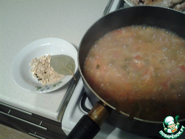 Добавляем лавровый лист, перец горошком и сушеный сельдерей. Пробуем на соль и перец. Если все по вкусу, то загружаем обратно бедрышки. Поглубже загружаем.